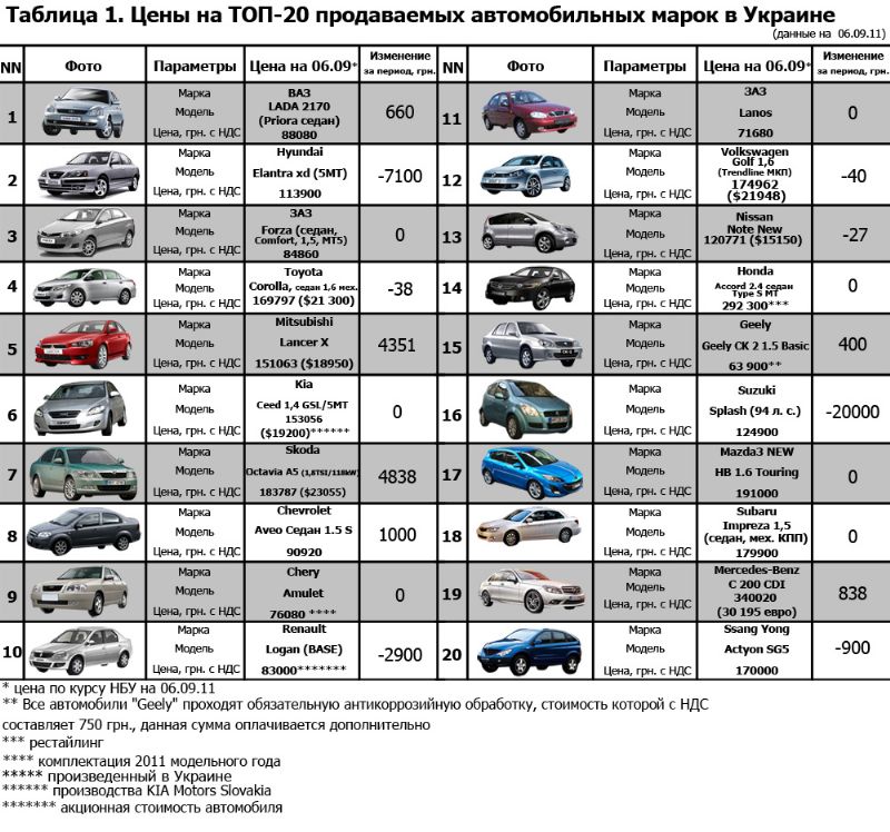 Смотреть Таблицу 1. Цены на Топ-20 продаваемых автомобильных марок в Украине*.
