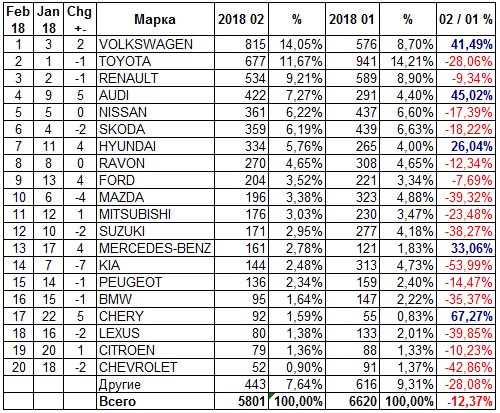 Благодаря Гольфу Volkswagen стал самым продаваемым брендом февраля – 815 авто. Второе место – у Toyota (677 шт.), а третье – у Renault (534).