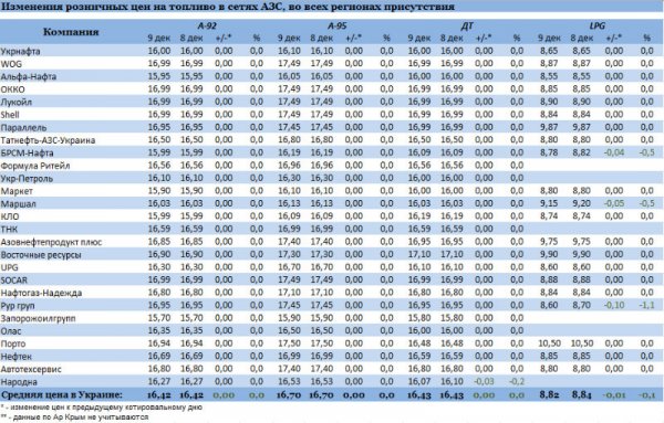 В конце ноября-начале декабря украинские заправщики снижали стоимость топлива на АЗС, однако к 9 декабря бензиновый котировки, откатившись на 52 коп., замерли.