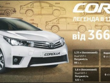Toyota Corolla одинадцятого покоління являє собою еволюцію нової дизайнерської мови Toyota — сучасніший дизайн, збільшений простір і комфорт, практичність і зручність в експлуатації, неперевершена економія пального, покращена динаміка водіння й удосконалені засоби безпеки. Автомобіль представлено в Україні з бензиновими двигунами на вибір: 1,33 л (99 к.с.), що працює з 6-ти ступеневою МКП та 1,6 л (122 к.с.) з 6-ти ступеневою МКП та варіатором (Multidrive S) у чотирьох варіантах комплектації на вибір.