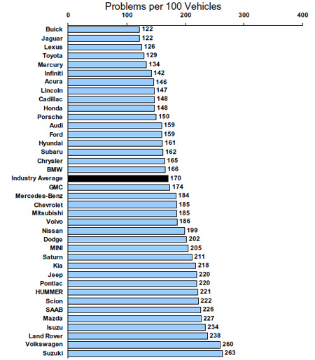 Оказалось, что у 100 владельцев Buick и Jaguar возникло в среднем 122 нарекания к своим машинам. И это учитывая тот факт, что средний показатель по всем брендам составляет 170. По словам экспертов J.D. Power and Associates, автомобили Buick и Jaguar все последние годы становились все более и более надежными, постепенно поднимаясь вверх в подобных рейтингах. И вот, наконец-то, они достигли вершины.