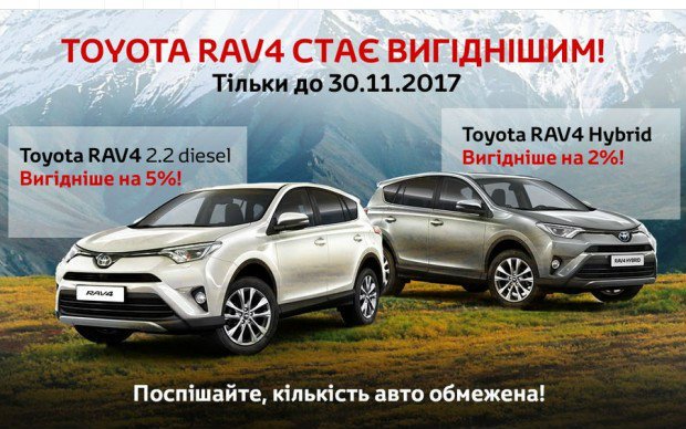 Шановні клієнти, повідомляємо вам, що тільки до 30 листопада 2017 в автосалоні Toyota ВіДі Автострада у вас є можливість придбати автомобілі Toyota RAV4 2.2 Diesel вигідніше до 5%* та Toyota RAV4 Hybrid з переднім приводом вигідніше на 2%.* Поспішайте, кількість автомобілів обмежена!.