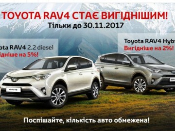 Шановні клієнти, повідомляємо вам, що тільки до 30 листопада 2017 в автосалоні Toyota ВіДі Автострада у вас є можливість придбати автомобілі Toyota RAV4 2.2 Diesel вигідніше до 5%* та Toyota RAV4 Hybrid з переднім приводом вигідніше на 2%.* Поспішайте, кількість автомобілів обмежена!.