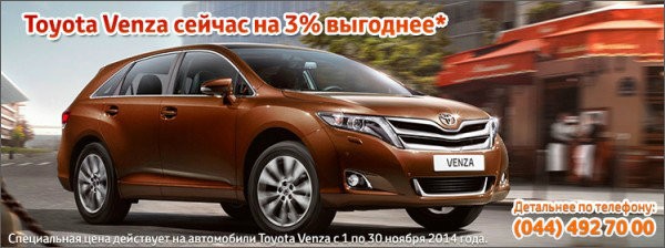 *Стоимость указана на автомобиль Toyota Venza в комплектации 2.7 Elegance FWD по состоянию на 31.10.14 г. и действительна с 01.11 по 30.11 2014 г.