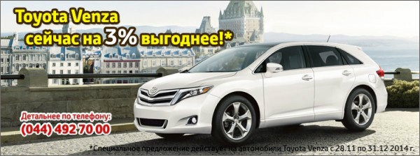 Получить дополнительную информацию о Toyota Venza и зарегистрироваться на тест-драйв Вы можете по телефону: (044) 4927000.