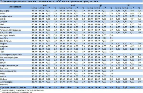 Сегодня, 13 января, цены на бензин на украинских АЗС остались без изменений. Средняя стоимость "двойки" по стране составляет 16,69 грн/л, а "пятерки" – 16,97 грн/л, сообщает .