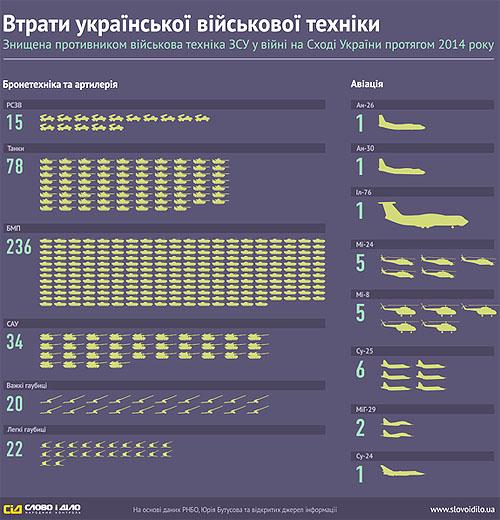 На инфографике потери не выглядят критическими для армии, хотя сражения в 2014 году велись очень ожесточенные и украинская армия наступала вплоть до конца августа 2014 г. Однако, здесь необходимо уточнить, что данные в инфографике приведены на основании официальных сообщений СНБО и статистики из открытых источников.