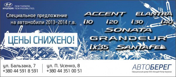 Только до конца декабря в автосалонах компании Автоберег, официального дилера ТМ HYUNDAI в Украине, действует специальное предложение на покупку автомобилей Hyundai i10, i20, Accent, Elantra, i30, Sonata, i40, Grandeur, ix35, а также Santa Fe!.