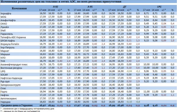 Волна подорожания, накрывшая топливный рынок в начале ноября привела к повышению средней стоимости "двойки" на 1 грн 43 коп., а "пятерки" – на 1 грн 47 коп. У большинства заправщиков премиум-сегмента "второй" предлагается по 17,20-17,60 грн/л, а стоимость "пятого" достигает 18 грн/л. В то же время, на АЗС эконом-сегмента бензином А-92 можно заправиться дешевле 17 грн/л, а "пятым" – до 17,20 грн/л.