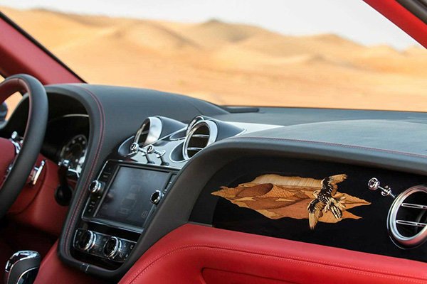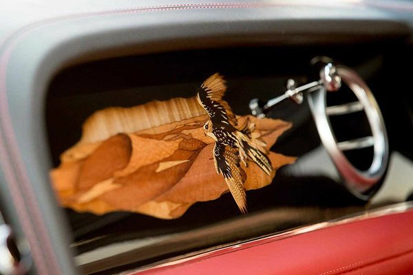 В салоне тоже находится насест для птицы, привязь на центральном подлокотнике и деревянная мозаика с изображением парящего сокола-балобана, выполненная в технике маркетри. Мозаика была изготовлена вручную из 430 кусочков древесины за девять дней. Для панно использовался шпон каштана, эвкалипта, остролиста, клена, оливы и волнистого платана.