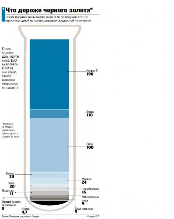 БЕНЗИН. Ожидают эксперты и снижения цен на нефтепродукты, но в Украине оно будет либо небольшим, либо его не будет совсем. Причина в том, что у нас с 1 января 2016 г. увеличен на 13% акциз на топливо — с 202 до 228 евро/т. В гривнях это примерно 60 коп./л. Плюс — девальвация гривни за последние дни с 25,6 до 26,4 грн/$.
