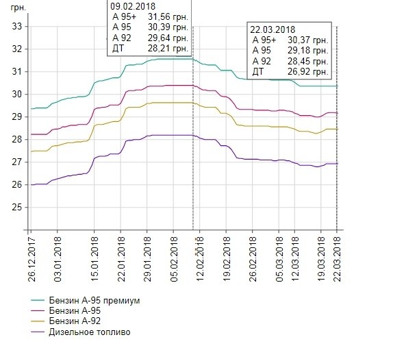 Так, с 9 февраля операторы начали снижать цены, в частности до 30,37 грн/л за А95 +, 29,18 грн/л за А95 и 28,45 грн/л за А92. Такая средняя цена на автозаправках была зафиксирована 22 марта. Данные привели в Консалтинговой группе «А-95».