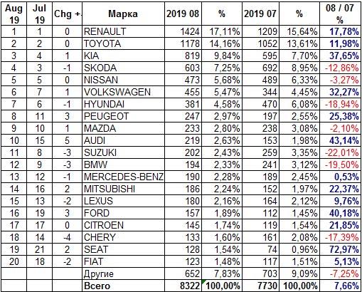 В августе это уже стало заметно по стремительному рывку Renault. Французы не только укрепились на позиции №1, но и реализовали на 18% больше авто, чем в июле. Toyota также прибавила в продажах, но ее рывка хватило удержать 2-е место. В тройку лидеров в августе зашли дилеры Kia, которым удалось нарастить продажи сразу на 37%.