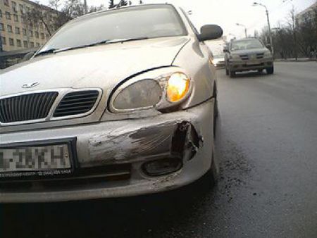 Lanos с разбитым бампером стоит в левой полосе, блокировав движение в сторону Московской площади.