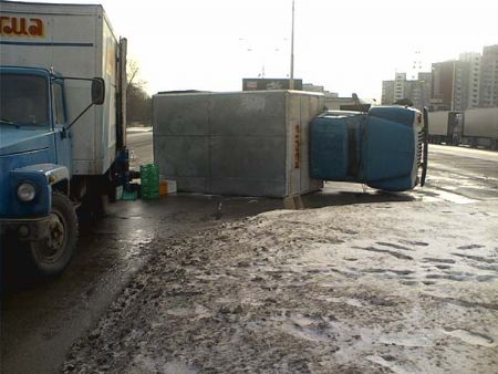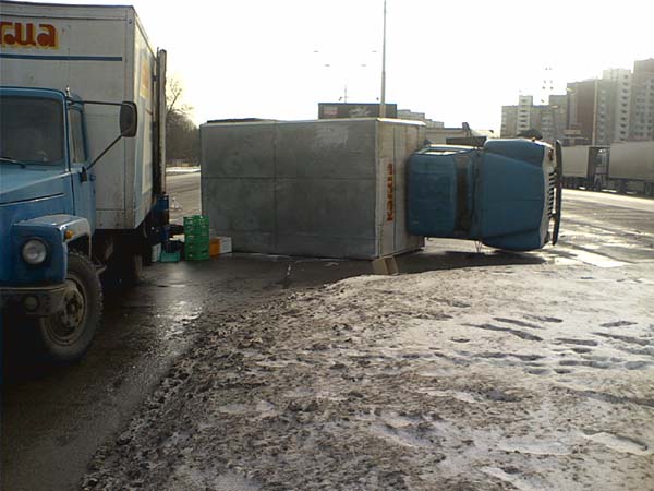 Две машины, Mitsubishi Galant и Daewoo Nexia, стояли на развороте. В этот момент в сторону Одесской площади по улице Ак. Заболотного двигался грузовик ГАЗон с будкой, который перевозил молочные продукты. По словам водителя, его кто-то подрезал, и он, чтобы избежать столкновения, резко совершил маневр - крутанул рулем. Поскольку машина высокая и груженая, она просто перевернулась, качнулась на боку и зацепила две стоячие машины.