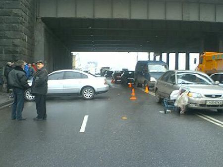 Volkswagen двигался в левой полосе, Kia захотела его объехать по правой полосе. Когда водитель второго авто повернул вправо, то увидел бабушку. Чтобы не сбить старушку, водитель Kia резко выкрутил руль влево, но все же зацепил бабку и ее „кравчучку” зеркалом машины. Потом толкнул в бок Volkswagen, который от этого закрутило и остановило об опору на обочине. Саму Kia вывернуло влево, где она и остановилась на распределительной полосе.