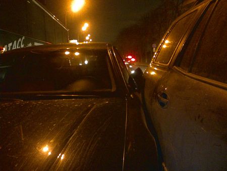 В этот момент, наверняка, очень спешил водитель Audi. Он хотел проскочить между автобусом и Hyundai, но не успел немного – коридор сомкнулся, и машина «забила гол» между автобусом и Hyundai. Из людей никто не пострадал.