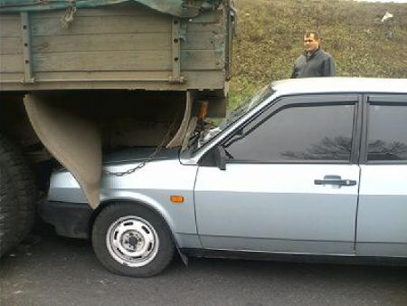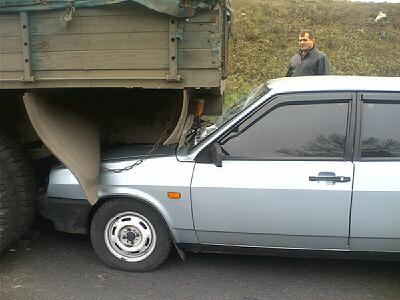 Так «девяносто девятый» оказался под грузовиком. Сам он получил поцарапанный капот и разбитое лобовое стекло. Хорошо, что ВАЗ был застрахован, ну и люди остались невредимыми.