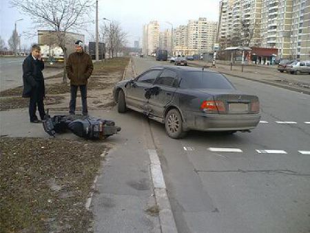 На ул. Ревуцкого, по направлению к Дарницкому кладбищу, водитель Mitsubishi на переходе сделал резкий маневр налево, но при этом не заметил маленького черненького скутера, ехавшего без света по левому ряду. Что случилось дальше, вы, наверняка, догадываетесь?, сообщает .