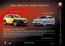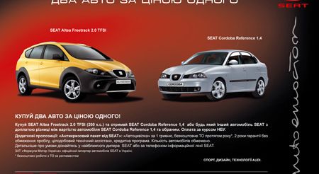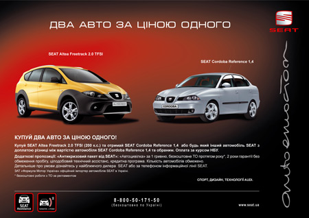 Впервые в Украине, официальный импортер автомобилей SEAT, компания Формула Мотор Украина, проводит беспрецедентную акцию – купи два авто по цене одного!.