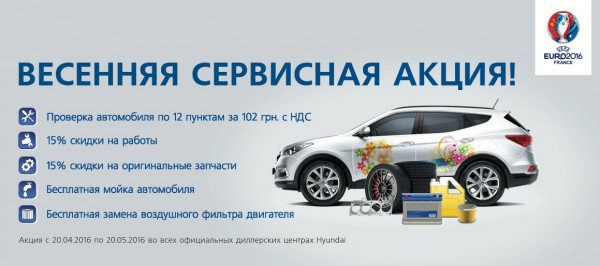 Официальный дилер автомобилей Hyundai в Киеве – компания «Олимп Моторс» - объявляет о запуске весенней сервисной акции, которая проходит в период с 20 апреля по 20 мая 2016 года на наших Станциях сервисного обслуживания.