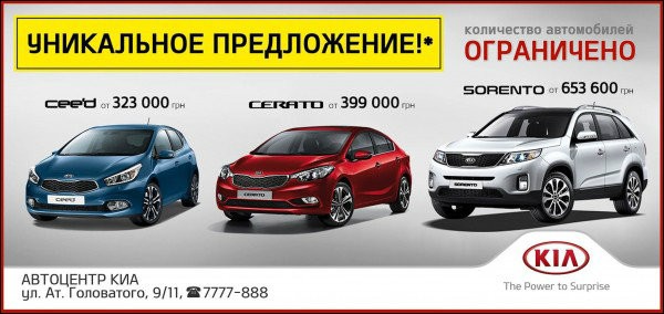 * Предложение действует в официальном дилерском центре в Одессе ООО "АВТОЦЕНТР КИА" с 04.02.2015 г. по 27.02.2015 г. На автомобили cee'd (base, mid, top), Cerato (top) и Sorento (top, top +) 2013 года производства. Детали уточняйте у консультантов. Цены с НДС по состоянию на 04.02.2015. Продавец имеет право без предварительного согласования изменить цены на автомобили. Количество автомобилей ограничено.