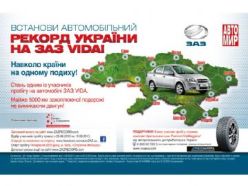 На каждом отрезке – от города к городу – управлять ЗАЗ VIDA можешь именно ты! Стать участником пробега всеукраинского масштаба может каждый автомобилист. Для участия необходимо пройти регистрацию на сайте www.zazrecord.com. По результатам предварительной регистрации, организатором проекта ДП «Бурда – Украина» согласно официальных условий, будут отобраны 12 участников, которые и присоединятся к установлению уникального рекорда Украины.