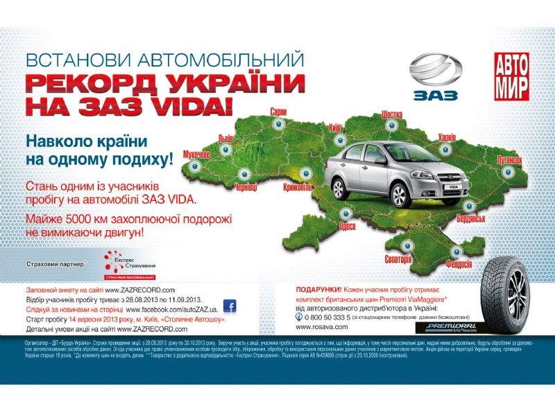 Время и место старт проекта – 14 сентября, Столичное Автошоу 2013, экспозиция ЗАЗ. Отсюда начнется многодневный пробег по всей территории Украины (около 5000 км!) на автомобили ЗАЗ VIDA – самый длинный маршрут с включенным двигателем, который станет рекордным для Украины!