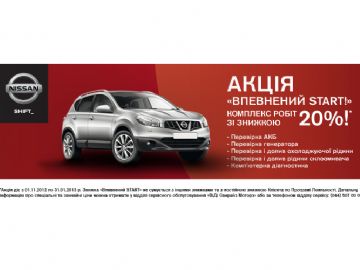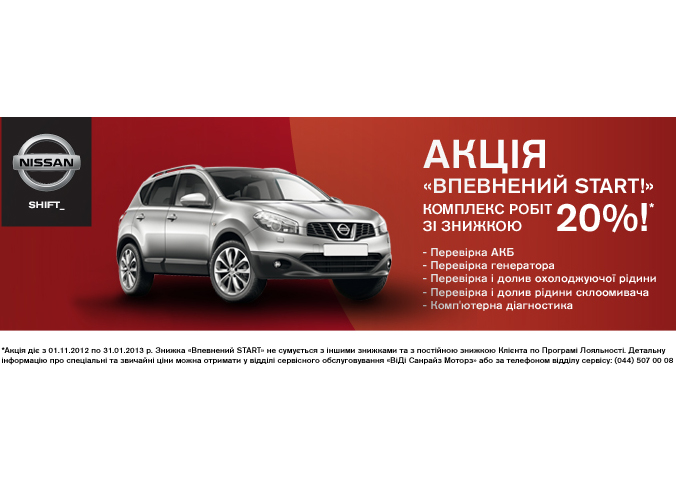 В период с 1 ноября по 31 декабря 2012 года в рамках акции «Уверенный START!» все Клиенты сервисной станции «ВиДи Санрайз Моторз» смогут воспользоваться скидкой 20% на комплекс работ по подготовке авто к зиме. Стоимость комплекса работ по акции «Уверенный START!» с 20%-ой скидкой составляет всего от 169 грн.* Кроме того, в акционный период Клиенты сервиса могут выгодно осуществить работы по смене шин.