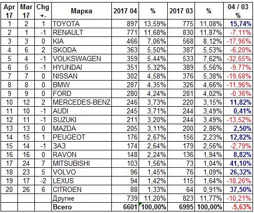 Nissan, BMW и Ford финишировали в апреле с теми же итоговыми результатами, хотя и темпы немного снизились.