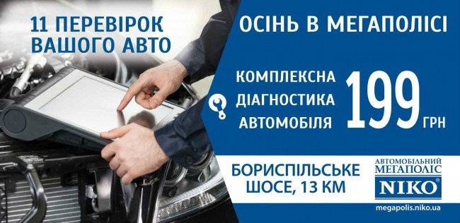 «Автомобильный Мегаполис НИКО» на Бориспольском шоссе объявляет о старте сервисной кампании «Осень в Мегаполисе». Воспользовавшись условиями акции, каждый автомобилист сможет на подготовить свой автомобиль к зиме с выгодой до 20%. Срок действия акции с 1 октября по 30 ноября.