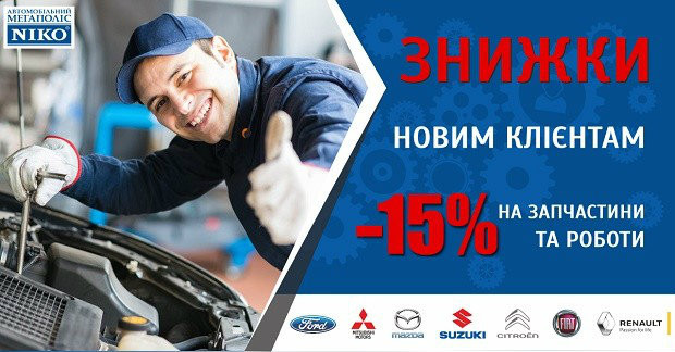 Только в период с 05 февраля по 05 марта 2018 года каждый новый клиент сервисных станций Ford, Renault, Fiat, Mitsubishi, Suzuki, Mazda и Citroen получит комплимент от «Автомобильного Мегаполиса НИКО» в виде скидки 15% на запчасти и 15% на работы к вашему автомобилю.