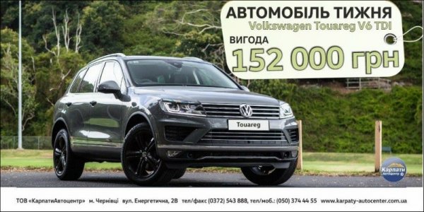 Вигідні умови кредиту чи лізингу, які діють в автосалоні «КарпатиАвтоцентр» допоможуть Вам стати власником автомобіля тижня – Volkswagen Touareg.