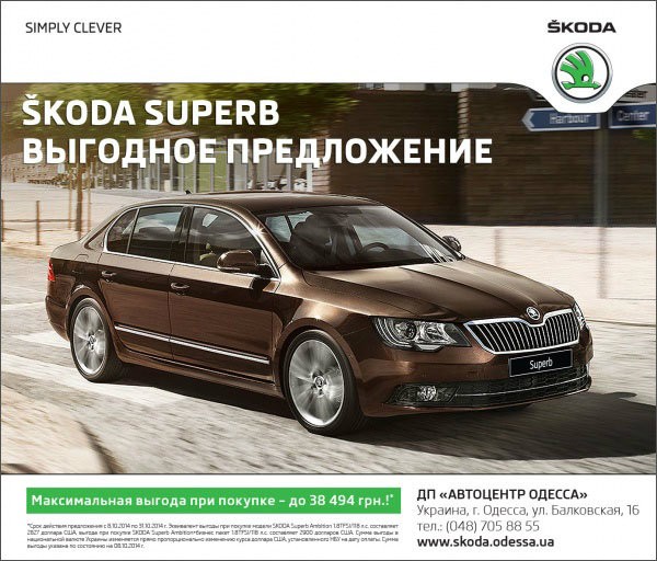 *Срок действия предложения с 8.10.2014 по 31.10.2014 г. Эквивалент выгоды при покупке модели SKODA Superb Ambition 1.8TFSI/118 л.с. составляет 2827 доллара США, выгода при покупке SKODA Superb Ambition+бизнес пакет 1.8TFSI/118 л.с. составляет 2900 долларов США. Сумма выгоды в национальной валюте Украины изменяется прямо пропорционально изменению курса доллара США, установленного НБУ на дату оплаты. Сумма выгоды указана по состоянию на 08.10.2014 г.