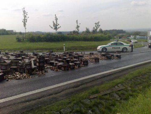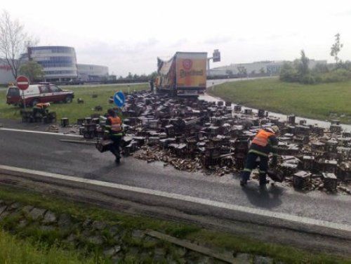 Это дорожно-транспортное происшествие произошло на автомагистрали в Чехии, в 15 километрах от Праги. Фура, загруженная поддонами с пивом до верху, на большой скорости повернула на перекрестке на право и ''золотое'' пиво посыпалось из нее, сообщает .