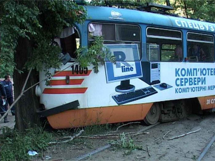 Вчера, в 18:30, в г. Днепропетровск, на ул. Севастопольской, водитель трамвайного поезда, двигаясь в направлении ул. Чернышевского, превысил технологическую скорость на участке с изношенной трамвайной колеей. Вследствие этого первый вагон сошел с рельсов и врезался в дерево.