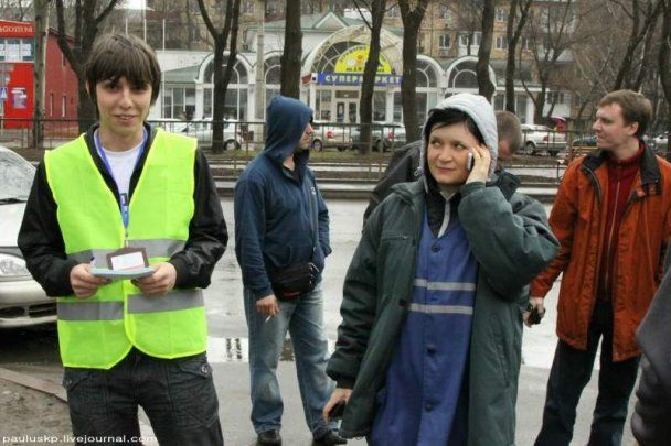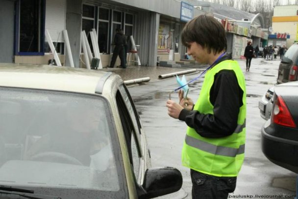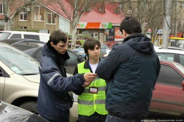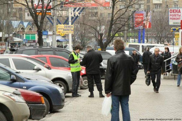 "За 45 гривен в магазине купили жилетку, а также бейдж, на котором неразборчиво написали "ДонецкАВТОХРЕНОВКА" и торговые чеки. В роли парковщика выступил студент-математик Саша, - пишет блогер. Деньги лжепарковщики в руки не брали.