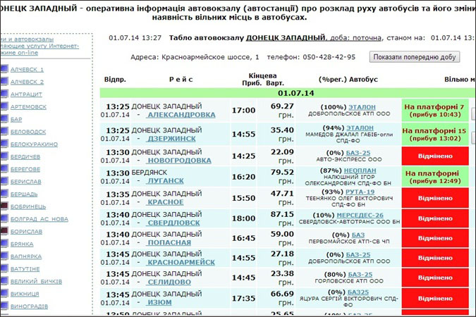 Впрочем, городов, с которыми нарушено транспортное сообщение, гораздо больше. На сайте донецкого автовокзала "Западный" расписание просто горит красным от обилия отмененных маршрутов в небольшие городки области.