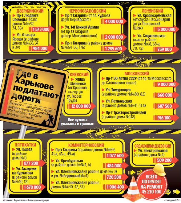 За эти деньги планируют частично отремонтировать 24 участка (см. иллюстрацию). Самой затратной статьей выступает проспект Шевченко. Капитальный ремонт на участке от Красного въезда до улицы Героев Труда выльется в 12 млн грн. Еще 9 млн «закатают» в проспект 50-летия СССР, 5 — в улицу 1-й Конной Армии, 4 — проспект Гагарина. По сравнению с затратами на ремонт проспектов и широких улиц, большинство пунктов в перечне — просто мелочи.