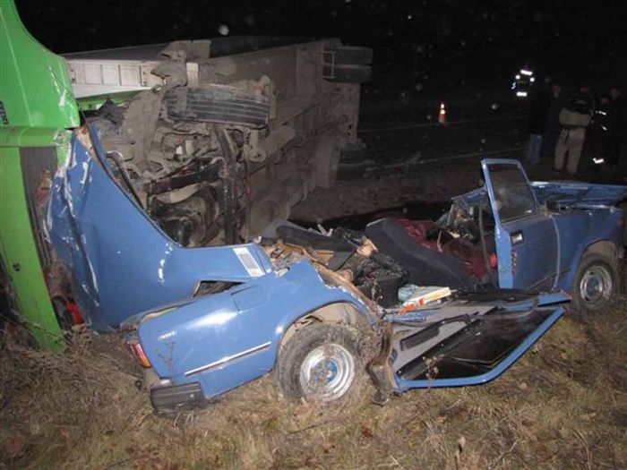 После мощного удара грузового автомобиля "Merscedes" отбросило на полосу встречного движения где совершил лобовое столкновение с автомобилем ВАЗ 21074, после чего грузовик перевернулся.