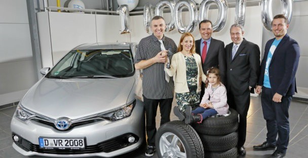Юбилейную модель Toyota Auris Hybrid приобрел Виктор Дугоникс из Германии. Семью счастливого обладателя гибрида ждал сюрприз от дилера - второй экземпляр машины был вручен его супруге, которая сможет бесплатно пользоваться машиной в течение следующего года.
