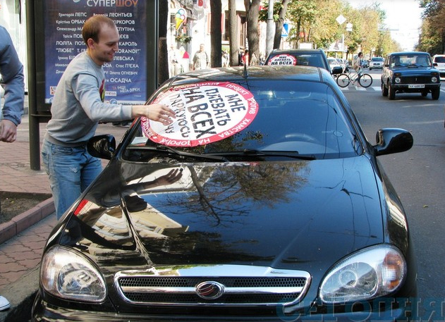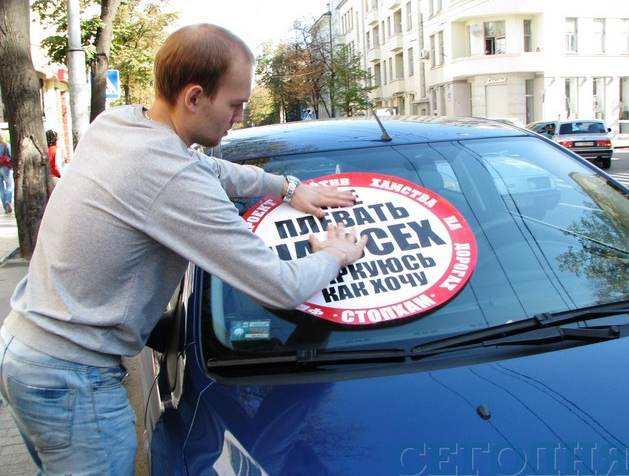 Но на Сумской, как назло, — ни одного нарушителя, все машины припаркованы по правилам. Приходится идти аж до перекрестка с Петровского, зато там активистам есть где развернуться! Под запрещающим знаком только с одной стороны стоит около 15 машин, все — без водителей. Первым наклейки удостаивается синий «Форд». Следом ребята «клеймят» «Сузуки», «Дэу», джип «Тойота». А вот владелец следующей иномарки оказался на месте. Узнав в активистах «стопхамовцев», он широко улыбается и без лишних уговоров соглашается перепарковать машину.