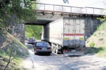 Проигнорировав знак, который запрещает проезд грузового транспорта по Крестьянскому спуску, он свернул с Набережной Победы и начал подъем. Когда водитель увидел впереди мост, то решил попробовать проехать под ним, думая, что высота достаточна для того, чтобы авто прошло. В итоге фура застряла. Пытаясь выбраться из «западни», водитель начал спускать колеса, чтобы сдать назад. Только через 40 минут ему удалось отъехать от моста. За это время позади фуры уже образовалась пробка. Как рассказал виновник случившегося, отказавшийся назвать свое имя, он по ошибке проехал нужный ему поворот и поэтому свернул на Крестьянский спуск. Видимых повреждений на мосту не было, но фура сорвала предупреждающие знаки, которые висели над дорогой возле виадука. На самом автомобиле также не было заметно ущерба, но водитель признался, что в результате этого ДТП «влетел на ремонт тысяч на пять».