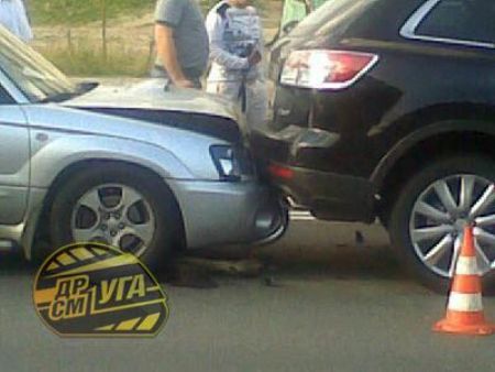 Не доезжая до Южного моста догнали друг друга три внедорожника: Mazda CX9, Subaru Forester и Toyota RAV4, сообщает .
