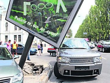 5 июля, днем, в центре города на бульваре Шевченко произошло коммунальное ЧП: на дорогой внедорожник Range Rover упал рекламный щит, крепление которого вырвало вместе с большим куском асфальта из-за прорыва труб. Что примечательно, там размещен рекламный слоган: «Делать то, что по душе», сообщает .