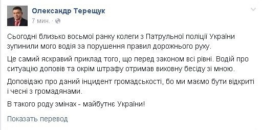 - Это самый яркий пример того, что перед законом все равны, - поделился с пользователями соцсети Александр Терещук. – Водитель о ситуации доложил и кроме штрафа получил воспитательную беседу со мной.