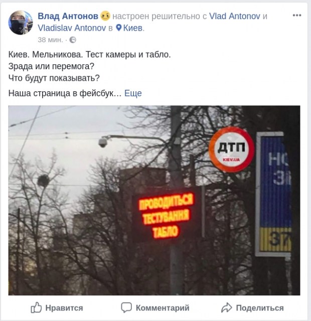 «Киев. Мельникова. Тест камеры и табло. Зрада или перемога? Что будут показывать?», — написал он в комментарии к фото.