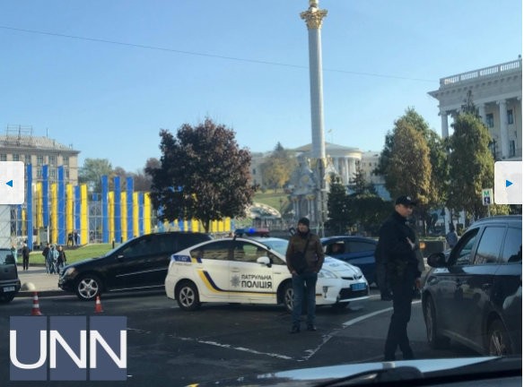 В центре Киева, возле Майдана Независимости перед въездом на улицу архитектора Городецкого, правоохранители проверяют авто.
