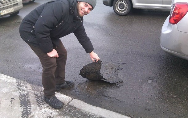 Так, киевлянин Роман Козуб у себя в Facebook показал, как "залатали" одну из ям на Кольцевой улице. Кусок асфальта буквально отклеился.