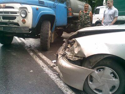 Водитель бензовоза ехал в средней полосе, когда потерял управление над автомобилем. Превысил ли он скорость или его авто было технически неисправным – установит следствие. Так или иначе, машину начало заносить. Во избежание трагедии, водитель начал тормозить, но на мокрой дороге грузовик развернуло и вынесло передними колесами на встречку. И как раз в этот момент в него врезался Daewoo, ехавший в попутном направлении по левой полосе. От удара легковушку отбросило метра на 1,5-2. К счастью бензовоз был пустой, иначе автомобиль мог бы перевернуться и взорваться.